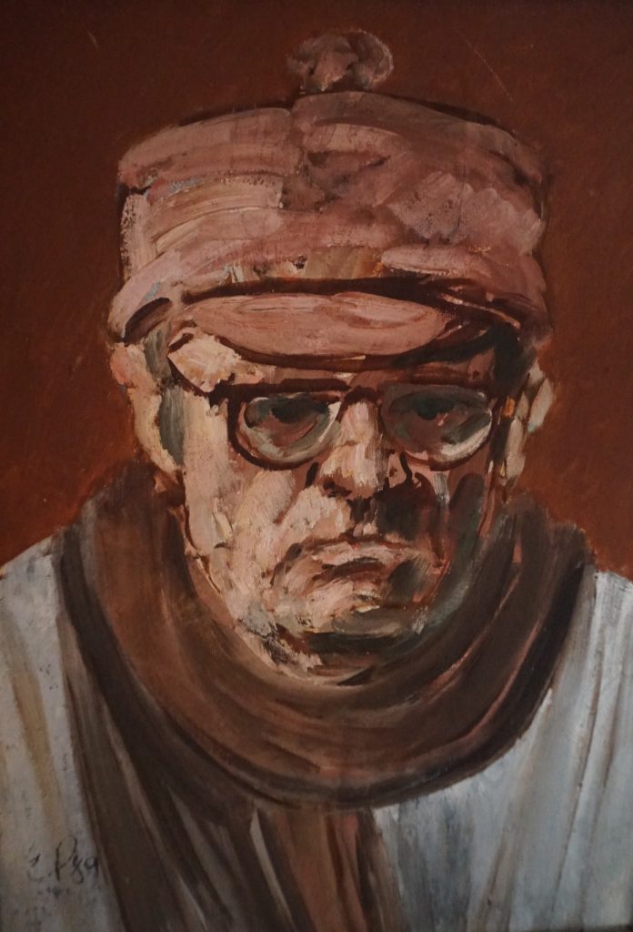 给他画像的是罗马尼亚画家博巴((Eugen Popa),当时在浙江美院主持一个油画训练班。博巴虽是油画家,但非常欣赏中国画,对潘老的作品更是由衷钦佩。两人经常促膝交谈。翻译小顾(黛丽)有时跟不上来,他们就用手势比划。也能相互领悟。博巴画的潘天寿像形神兼备。背景上用油画笔模彷潘老笔法画的岩石和秃鹫,几乎达到潘老原作的功力。